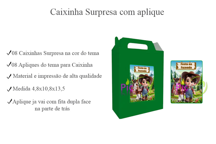São 8 caixinhas na cor do tema e 8 apliques do tema para ser personalizada.