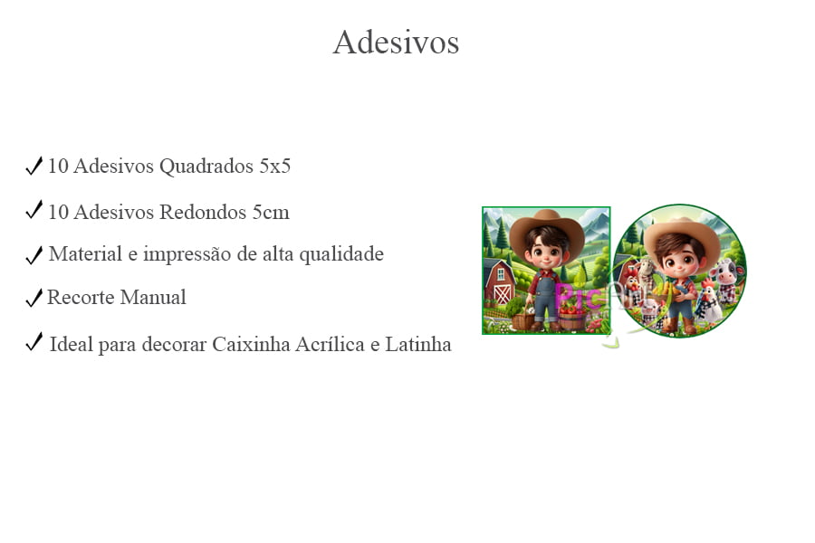 São 10 adesivos de cada com 5 cm, personalizados no tema escolhido;