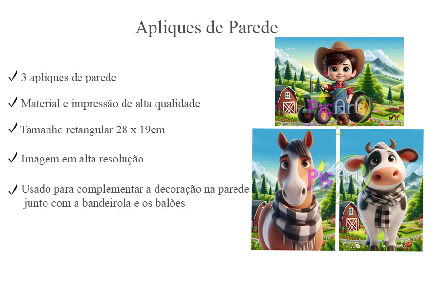 Neste Kit vão 3 apliques de parede que são imagens de personagens do tema escolhido.