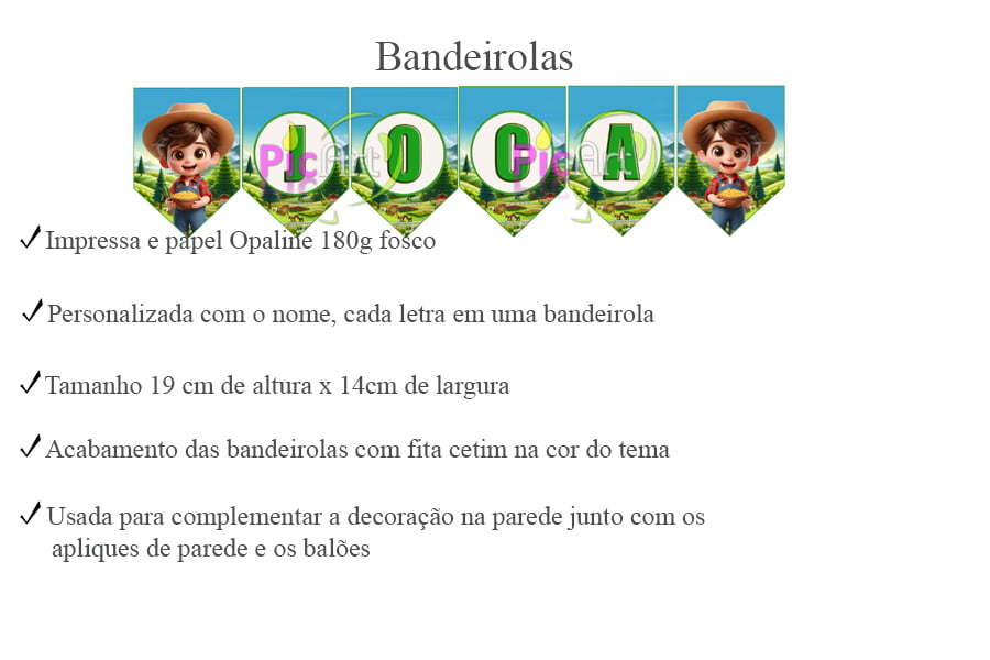 Cada letra vai em uma bandeirola e personalizamos as bandeirolas com o tema escolhido.