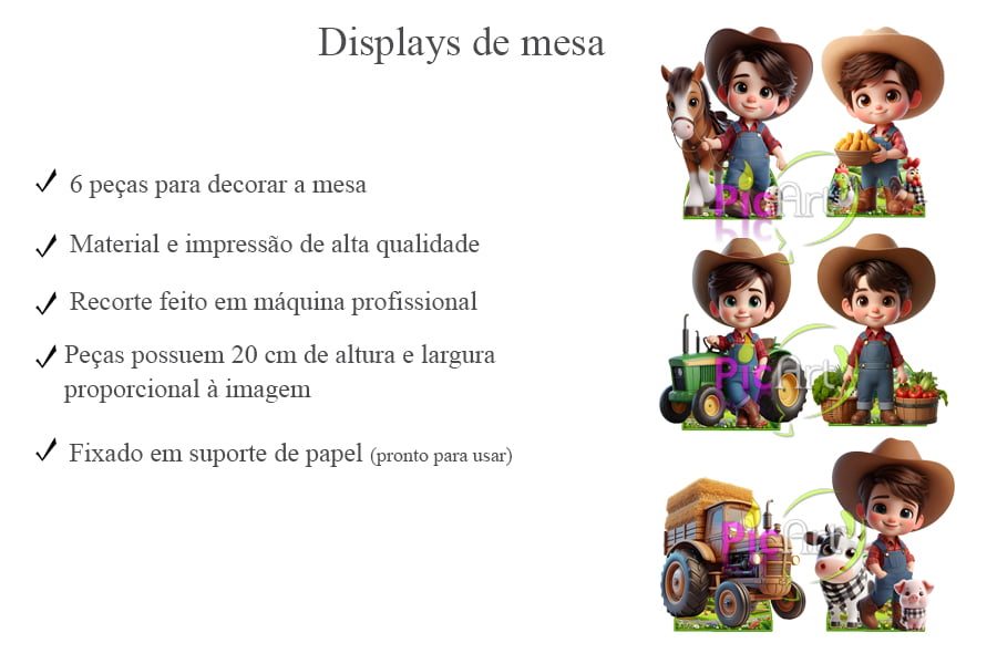 Neste Kit Aniversário Personalizado vão 6 peças /display com 20cm de altura e a largura da peça é proporcional a imagem. As peças são personagens de acordo com o tema.